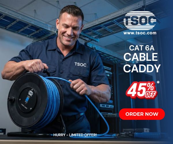 The TSOC Cable Caddy is an innovative Plug & Play solution designed for quick deployment of temporary connections in low voltage cabling networks. It allows technicians to easily deploy, retract, and manage cable runs in data centers, telecom rooms, and job sites.